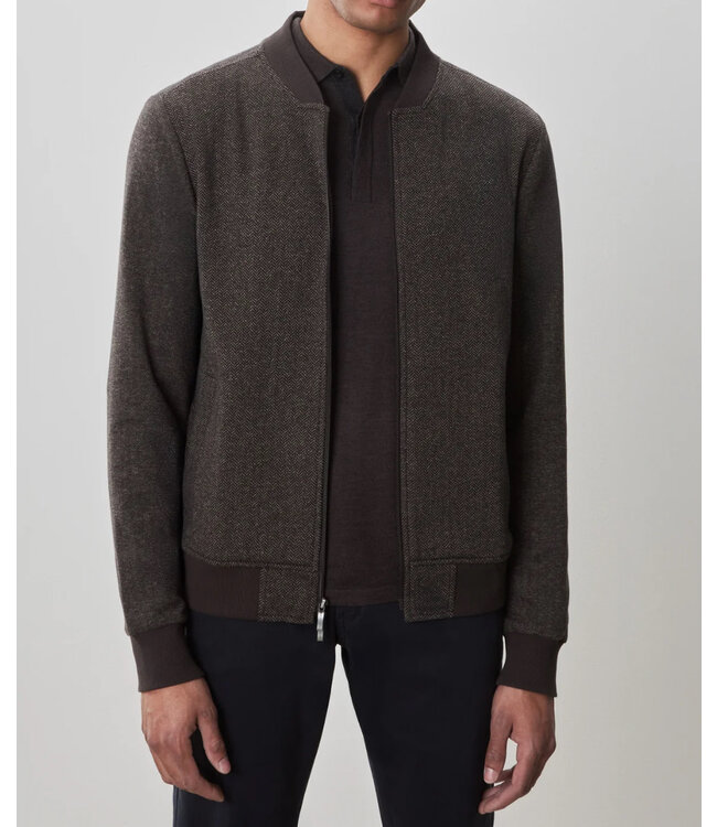 Elevate your casual look with this brown full zippered layering piece in an attractive herringbone pattern. It has a dual zipper for convenience and the ribbed baseball collar, sleeve cuffs and waistband adds a sporty style.