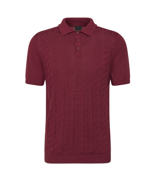 Gorgeous burgundy colour and knit style in this linen blend short sleeve three button polo with a soft hand feel. It has an elevated panel design on the front with solid sleeves and back, ribbed knit collar, sleeve cuffs and waistband. Classy option for the summer in a modern fit with casual or dressy pants and also works under a sport coat or suit.