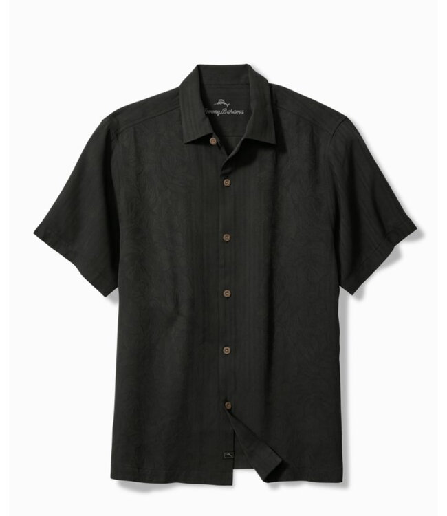 Luxurious comfort and style in this black silk short sleeve camp style shirt. It has a tonal jacquard pattern with brown buttons and side vents for an easy relaxed style.