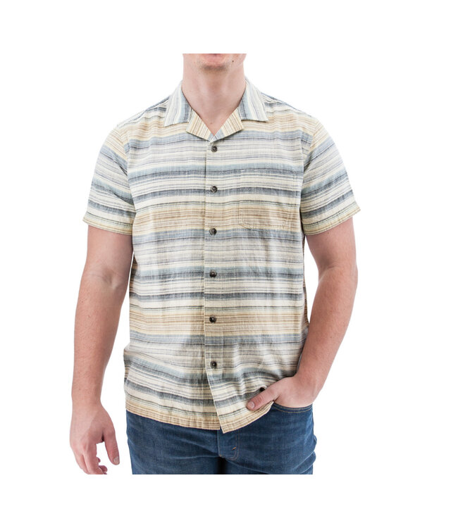 Summer fun in this multi coloured stripe camp style short sleeve shirt. Soft, casual feel in a button up with chest pocket and straight hem so it's meant to be worn untucked. Perfect for the beach days with your shorts.