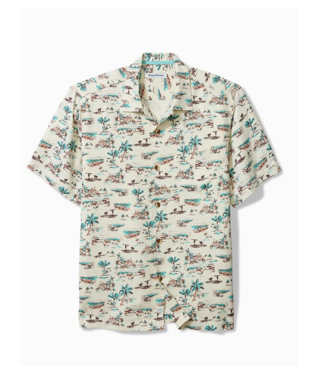 Super fun vacation shirt in this cream coloured silk camp shirt with beach and Hawaiian houses, surfers and palm trees. Totally relaxed style and fit with the side vents to go untucked with your shorts or casual pants and important chest pocket.