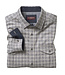 Long sleeve grey sport shirt in a small blue plaid button up style with two buttoned chest pockets. It has a contrast navy gingham on the inside of the collar and sleeve cuffs. The curved hem allows you to wear untucked if you like as an overshirt with your jeans or cotton pants.