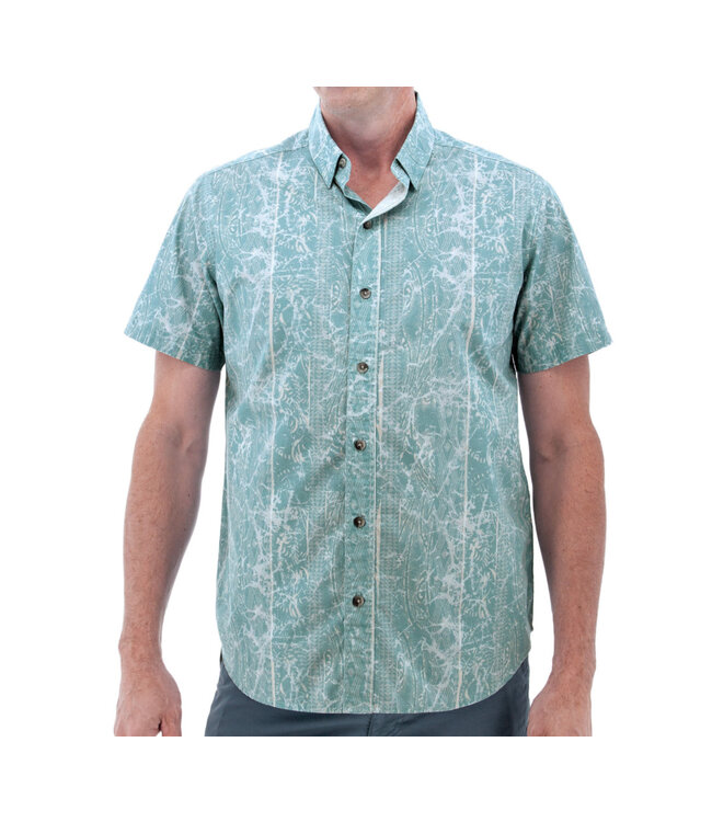 Sleek style in this teal short sleeve shirt with an abstract pattern. Classy hidden button down collar with a curved hem if you like to go untucked with your shorts or casual bottoms.