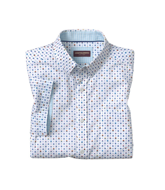 Cotton comfort in this white short sleeve shirt with colourful flower pattern. It has a hidden button down collar, chest pocket and white and blue geometric pattern on the inside of the collar and sleeve cuffs.