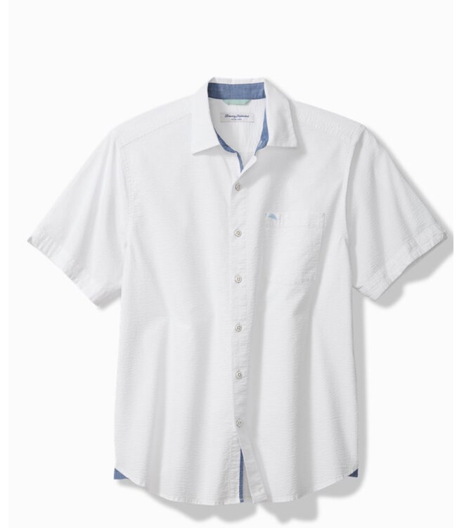 Casual comfort in this textured lightweight white cotton short sleeve shirt with some stretch for easy movement. Tommy has a generous, classic fit and a chest pocket on the left. The denim look on the inside of the collar adds a little detail you can coordinate with your shorts.