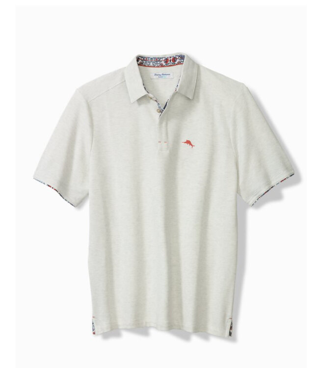 Live the island life with this continental white and grey heathered Santa Rosa short sleeve five o'clock Island Zone polo from Tommy Bahama. Pique style three button polo with floral trim on the inside of the collar, sleeve cuffs, side vents and covered button placket. Easy style to pair with your shorts or casual bottoms.