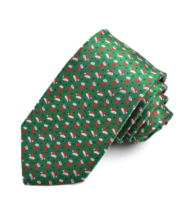 Get ready for Santa with this super fun green Italian pure silk tie with red Santa hats and boot pattern. Effortless way to dress up your festive outfit for the season.