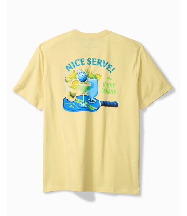 Serve up some drinks and the sun in this yellow short sleeve graphic t-shirt. The front is plain with a chest pocket, Tommy Bahama and marlin logo. Super fun on the back with saying "Nice Serve!" with a pickle ball paddle and drinks.