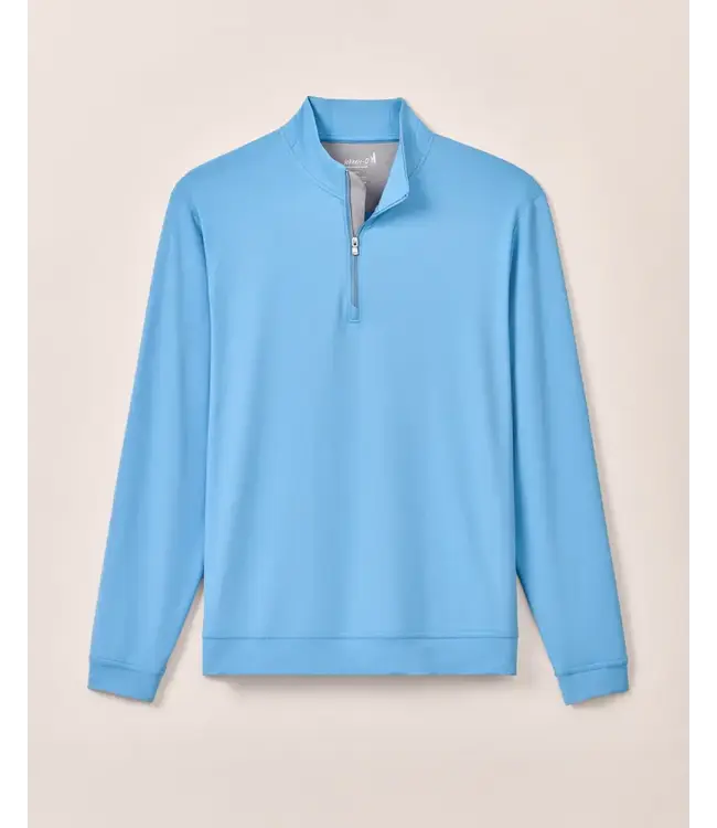 Sporty vibes and the perfect layering piece for performance and everyday wear with its dri-release fabric. Attractive malibu blue in a 1/4 zip design, stand up collar, banded sleeves and waistband. The stretch and breathability is appreciated and allows you to move freely at work or play.