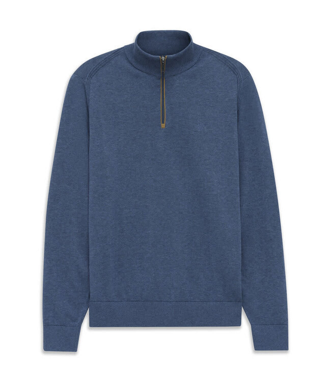 Simple and classy style in this mid blue 1/4 zip pullover sweater from Bugatti. Effortless way to elevate your dress shirt at the office or add a little colour over your sport shirt with your denim. The ribbed collar, sleeve cuffs and waistband give you a sophisticated and tidy style while the tan trim at the zipper adds a little contrast.