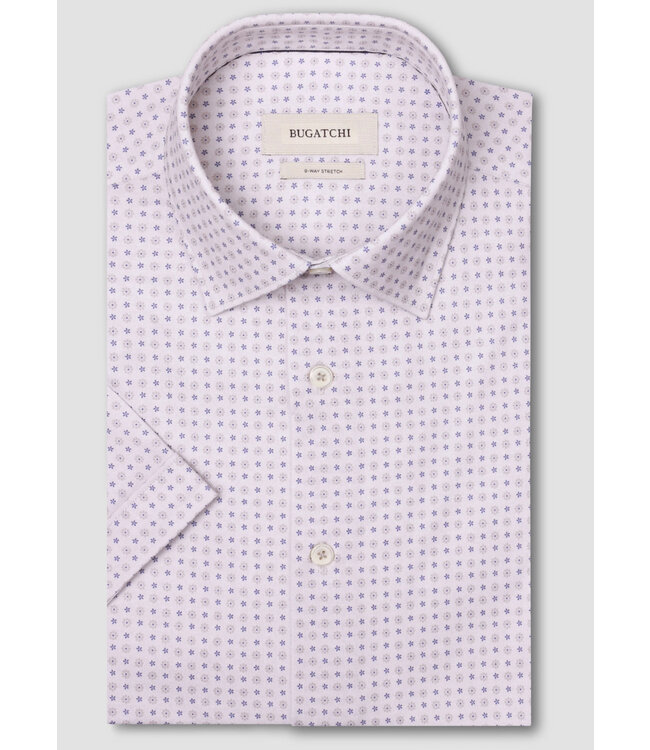 Almond short sleeve with a small flower pattern in blue and grey in Bugatchi's Oooh cotton technology eight way stretch. Easy movement and easy care with its point collar, geniune mother of pearl buttons and classic cap sleeve. The subtle pattern makes it easy to coordinate with your casual bottoms and denim and also works under a sport coat without a tie.