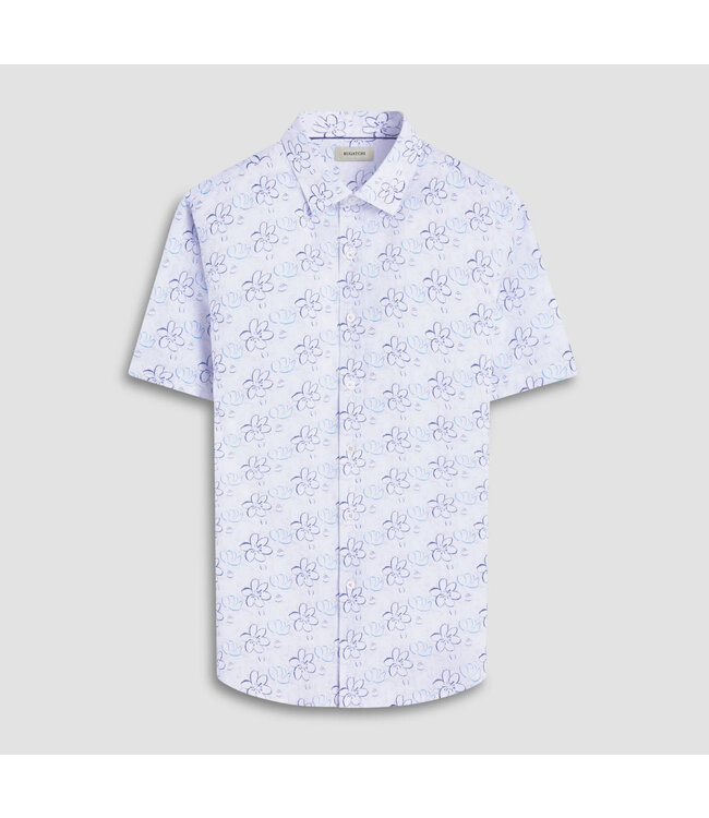 Attractive blue and navy floral pattern in this cotton white short sleeve shirt. It has a point collar, genuine mother of pearl buttons and a curved hem if you like to wear untucked with your shorts or casual pants.