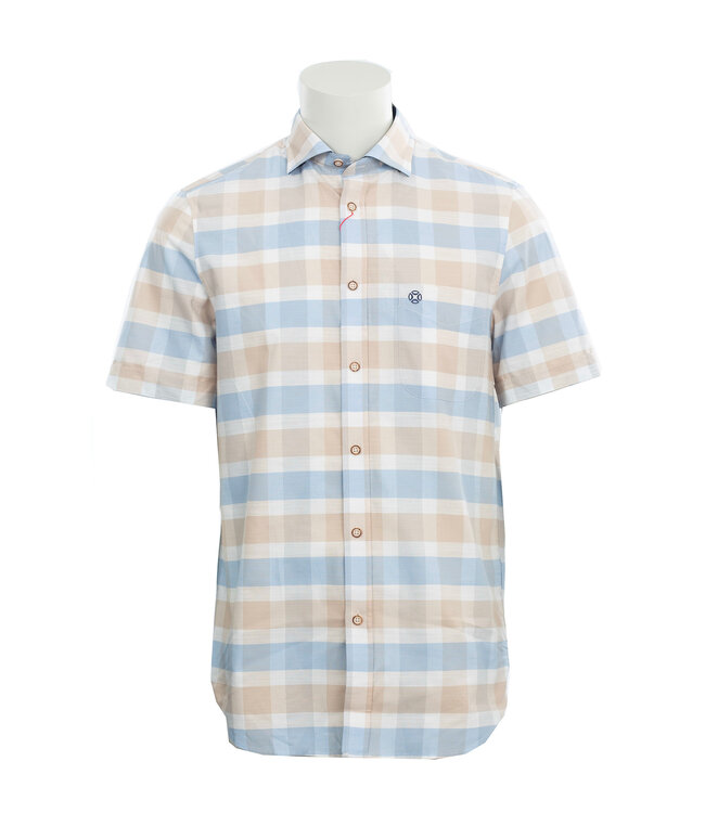 Charming cotton short sleeve shirt with a tan and blue wide stripe pattern. It has a hidden button down collar, chest pocket and dark navy contrast on the inside of the collar.