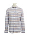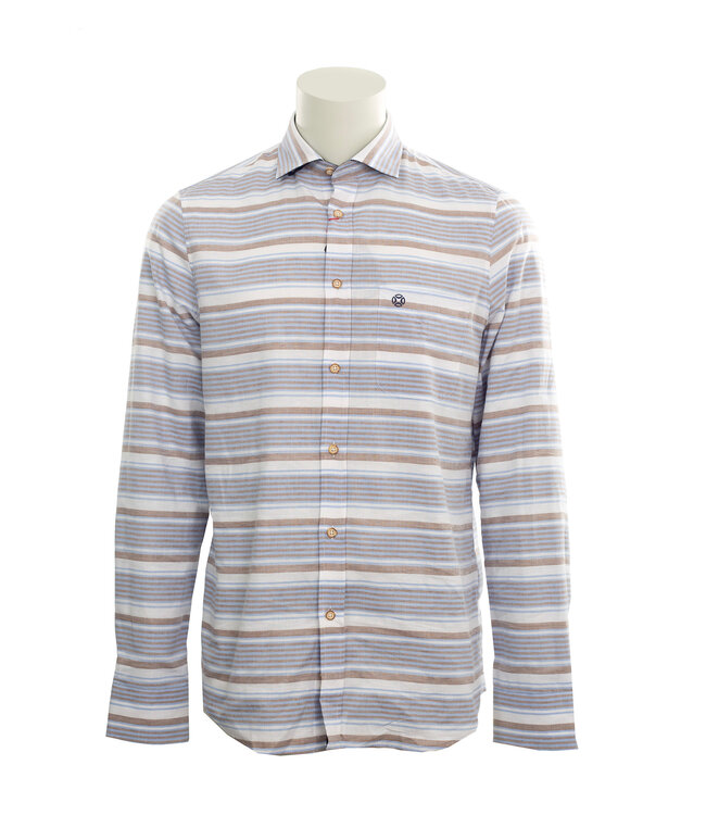 Long sleeve beige, blue and brown multi stripe in this cotton and linen blend sport shirt. Classy hidden button down collar and chest pocket. It has a contrast navy on the inside of the collar and sleeve cuffs as well as double button cuffs. Easy match with your casual bottoms and shorts.