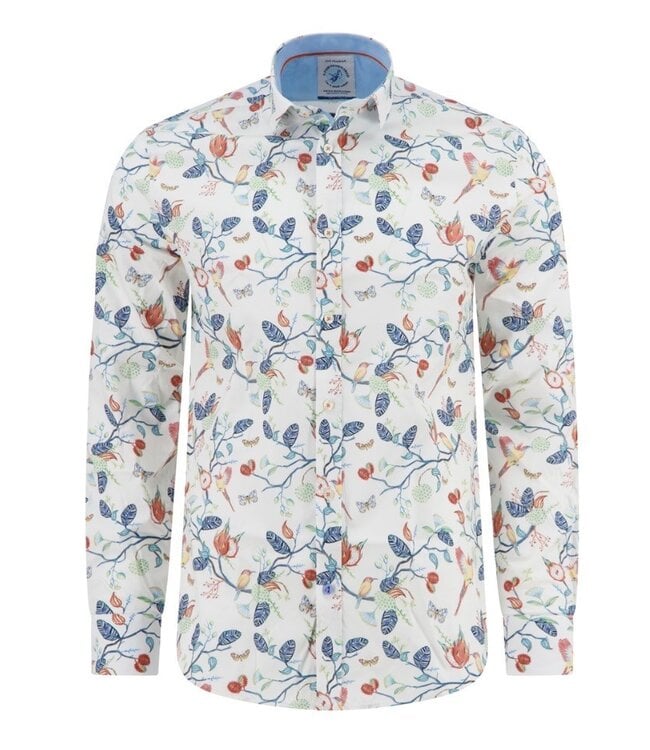 Summer fun in this white long sleeve sport shirt with colourful trees and bird pattern from A Fish Named Fred. Striking pattern on its own with your shorts or chinos or elevate your look with a coordinating sport coat for a special event or the office. The signature details are great including the name embroidered on the inside of the left sleeve cuff, fish scaled buttons and coordinating stitching. The cotton has a great feel and the little bit of stretch is always welcomed.