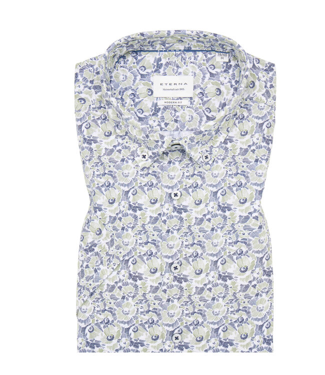 Navy and green floral short sleeve shirt in a modern, contemporary fit. This seersucker style allows air circulation in its crepe like fabric keeping you pleasantly cool. It has a button down collar and a curved hem so you can wear untucked for a more casual style.