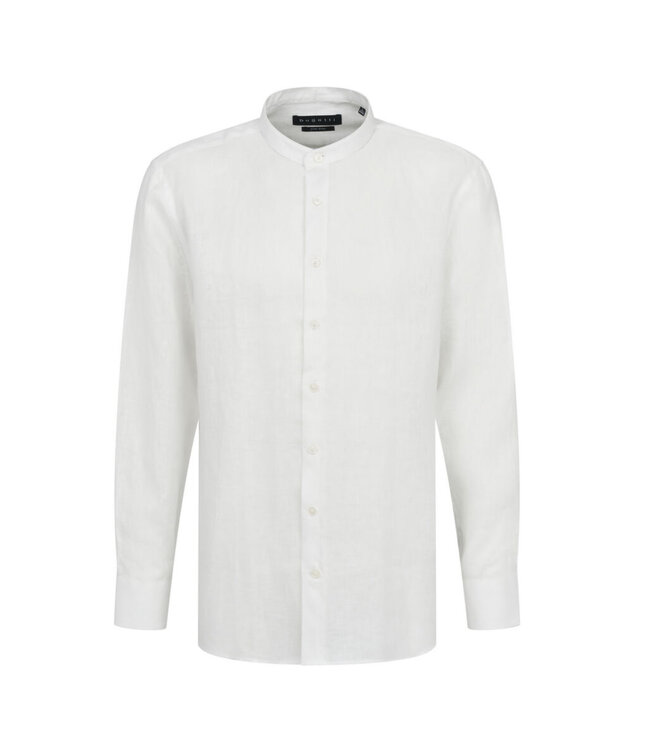 Enjoy the comfort of this long sleeve white linen sport shirt with a banded collar. Linen is a natural, breathable fabric and known for its strength and ability to absorb moisture making it a great option when its hot and humid. The button up style has a simple yet effective style with a double buttoned sleeve cuff. Attractive style you can pair with your shorts or dressier pants at the office.