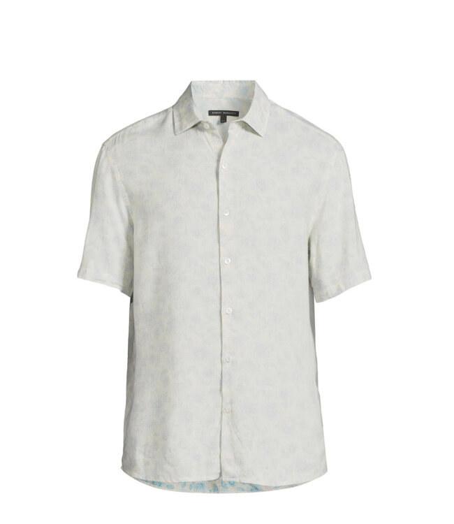 Casual comfort in this subtle soft teal floral printed beige short sleeve Merrick shirt. Quiet confidence and relaxed style at work or play with any style bottoms.