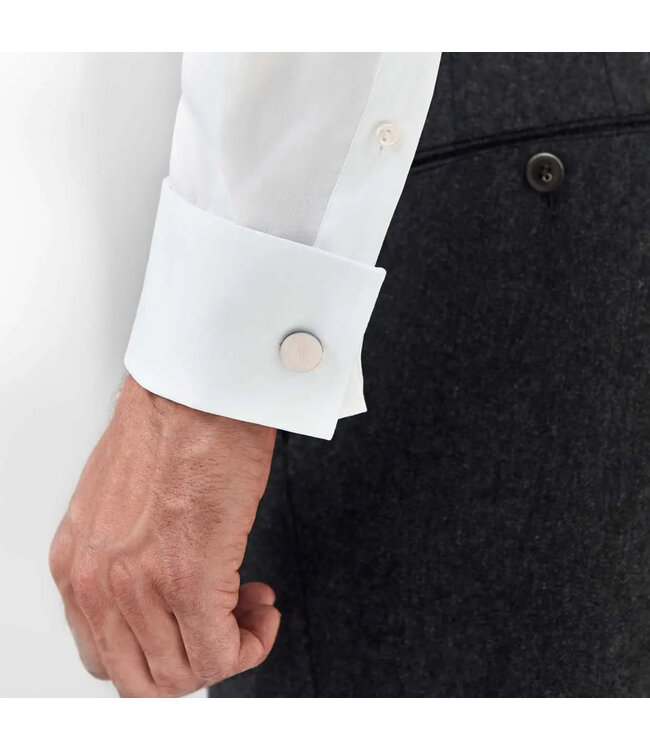 Crisp white long sleeve french cuff shirt with a medium spread collar, white buttons and navy blue silk knot. Timeless style for an exquisite event, crease-resistant finish for an all day and night performance. Effortless look and perfect fit that lasts. The silk knot can be easily changed up for your favourite cufflinks.