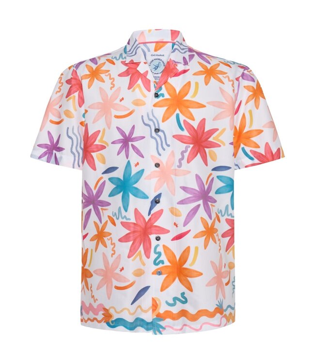 Summer fun in the sun with this white short sleeve shirt from A Fish Named Fred's Sahara Sunset Collection with this vibrant oversized watercolour flower pattern. Enjoy the comfort and casual camp style shirt meant to be worn hanging out with your shorts, casual pants or denim.