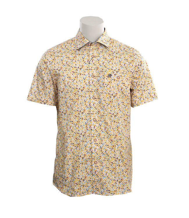 Summer style in this yellow short sleeve shirt with a fun multi coloured geometric pattern. Contemporary design with its hidden button down collar, chest pocket and contrast navy on the inside of the collar.