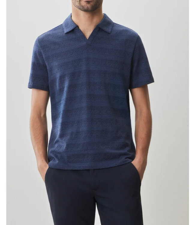 Contemporary navy blue short sleeve polo with an open collar and tonal stripe design. It has a super soft feel and sophistication suitable for any occasion.