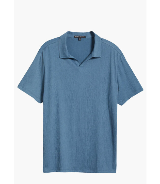 Featuring this oceanview blue short sleeve polo with a contemporary open collar. It has a drape style adding some texture in a cotton blend and effortless style you can coordinate with your shorts, casual bottoms and denim.