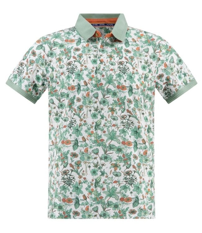 Feeling the warmth of summer in this olive green floral printed short sleeve three button polo. It has a ribbed knit green collar and sleeve cuffs, signature fish scaled buttons and orange contrast on the inside and under the collar adding a punch of colour coordinating with the floral print.