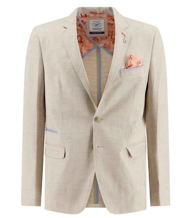 Start your summer off with the perfect sand coloured sport coat with a linen look. Stunning blazer with fun details that is always a crowd pleaser like the fish hook lapel pin, light blue trim on the chest and ticket pocket and fun peach abstract city pattern 1/2 lining on the inside of the jacket, pockets and built-in pocket square. Add the matching polo (sku #33.304 456) for a fun outfit out with friends or dress up your look for the office or special occasion with a sport shirt matching your chinos. Always a great catch with A Fish Named Fred.