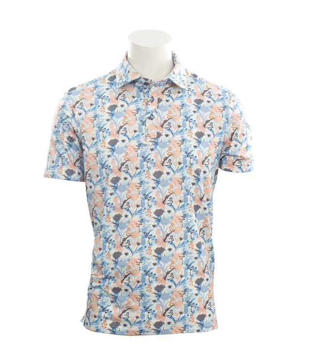 Super soft feel in this short sleeve tan and blue floral pattern polo. Plenty of stretch to get you through your day in this three button closure, hidden button down collar and complimentary floral pattern on the inside of the collar and sleeves.